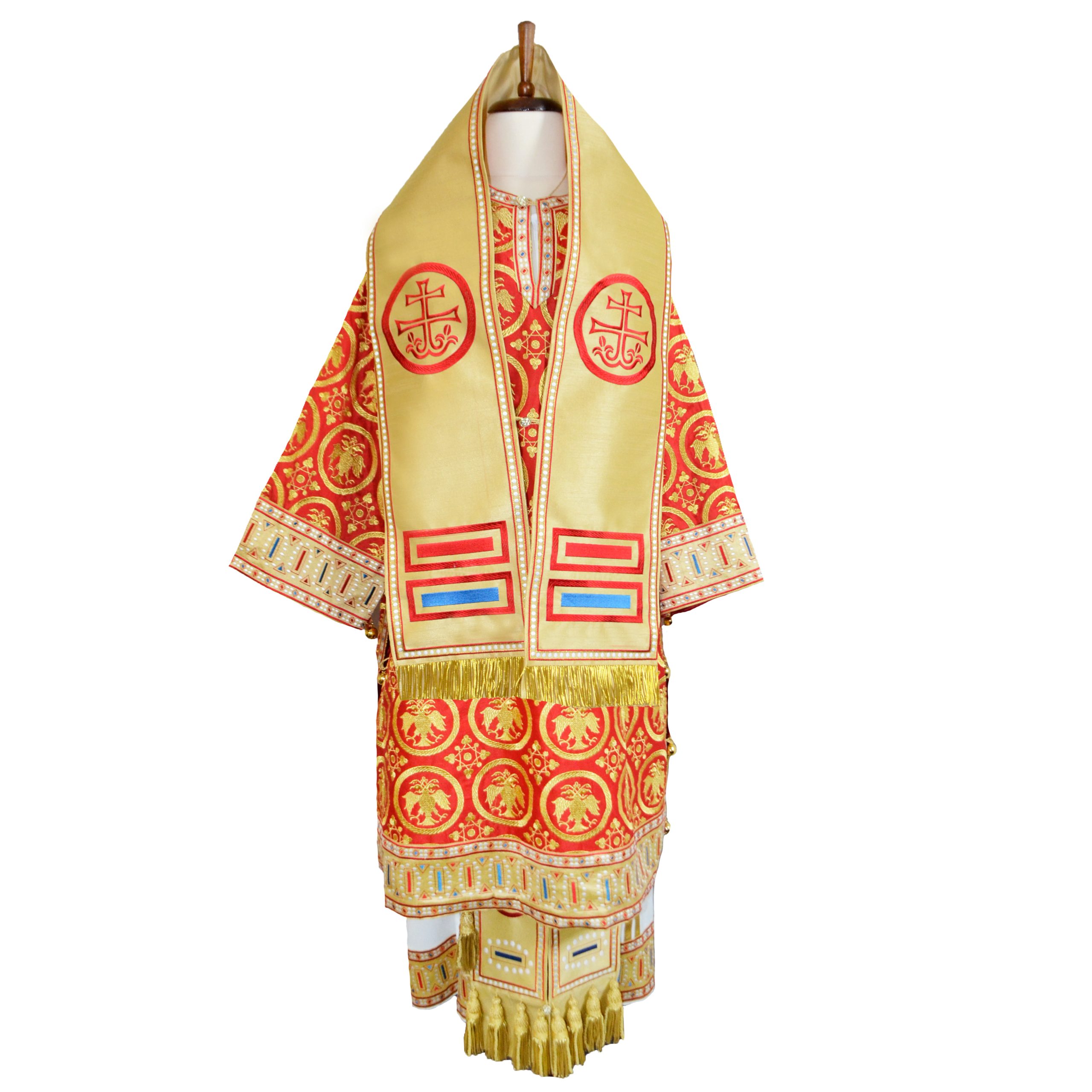 The set consists of small and big omoforion, epitrachelion, sakkos, sticharion, epimanikia, belt, epigonation.